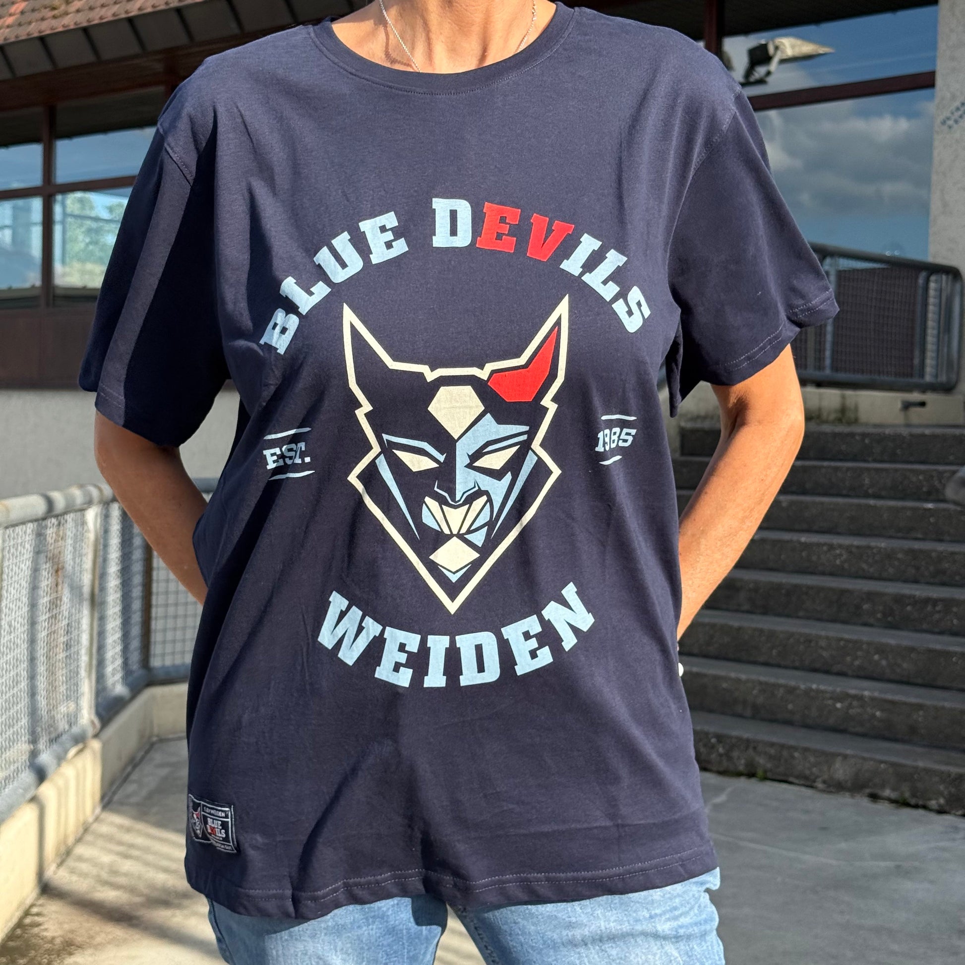 Blue Devils Weiden Schriftzug/EST. 1985/Logo gedruckt.